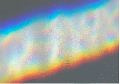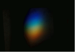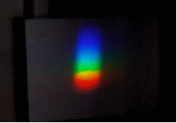 Die Standardglasprismen ohne Bleizusatz zeigten zwar prinzipiell dieselbe Farbverteilung, insgesamt allerdings ein deutlich flaueres Bild mit stark verwaschenen Übergängen. Auch erschien das Bild insgesamt größer, da die Übergänge zwischen den farbigen Anteilen und dem Hintergrund wesentlich undeutlicher verliefen. Darüber hinaus zeigte die Abbildung eine weiße Mitte, welche selbst im Abstand von 5,20m hinter dem Prisma noch zu erkennen war, zumal sich generell ein hoher Anteil weißen Streulichts in das gesamte Bild mischte (siehe Anhang, Abb. 11, 12, 13).